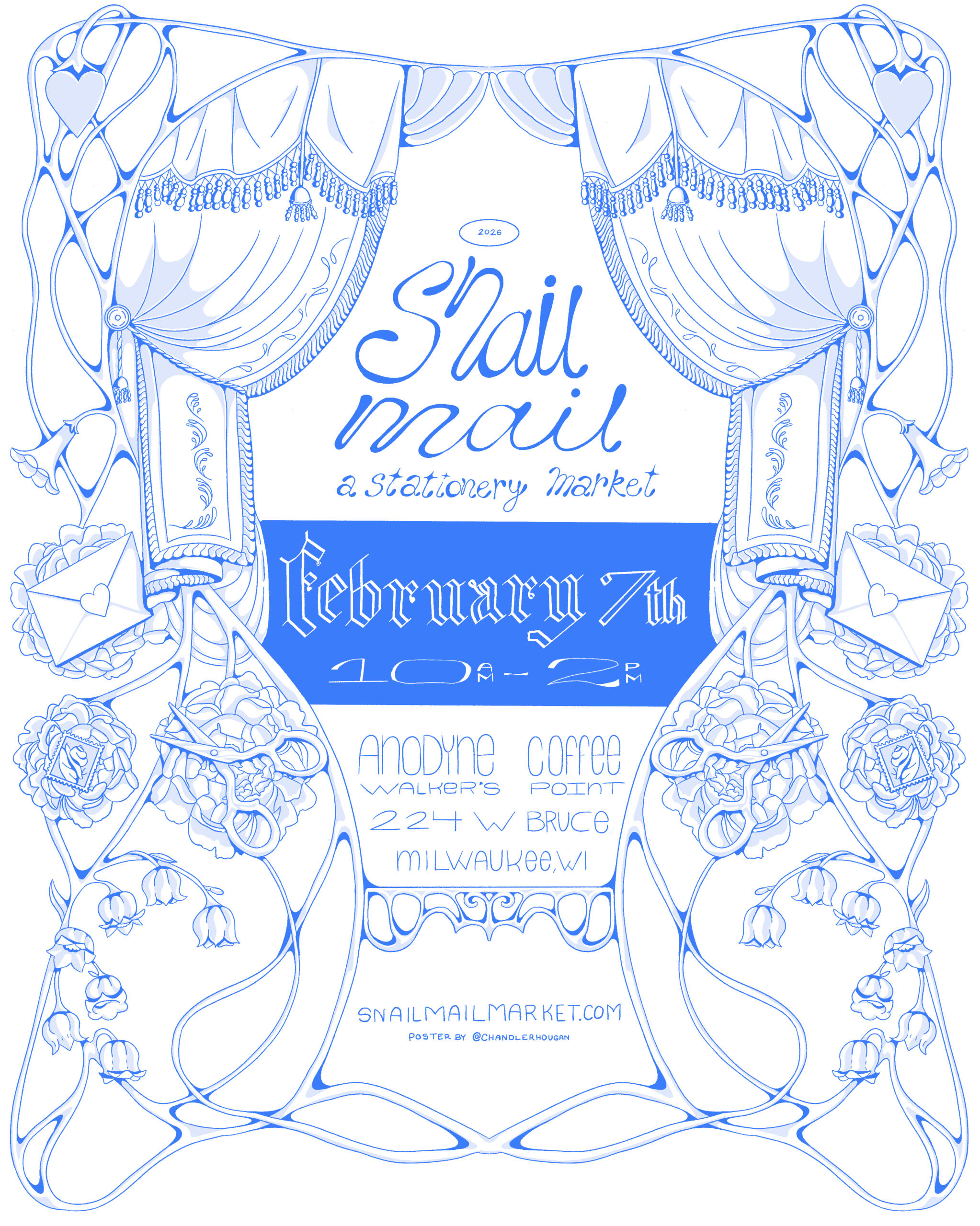 Just finished the 2026 Snail Mail Poster! I am very happy with how it turned out, I was inspired by Victorian and Art Nouveau designs. Applications will open on December 1st! We’re so grateful to everyone who participated in last year’s market! To keep things fresh and provide opportunities to new vendors, we’re giving priority this year to those who haven’t vended with us before. As a result, we won’t be accepting applications from past vendors for this year’s event. We truly appreciate your support and hope to see you at the market as a guest!